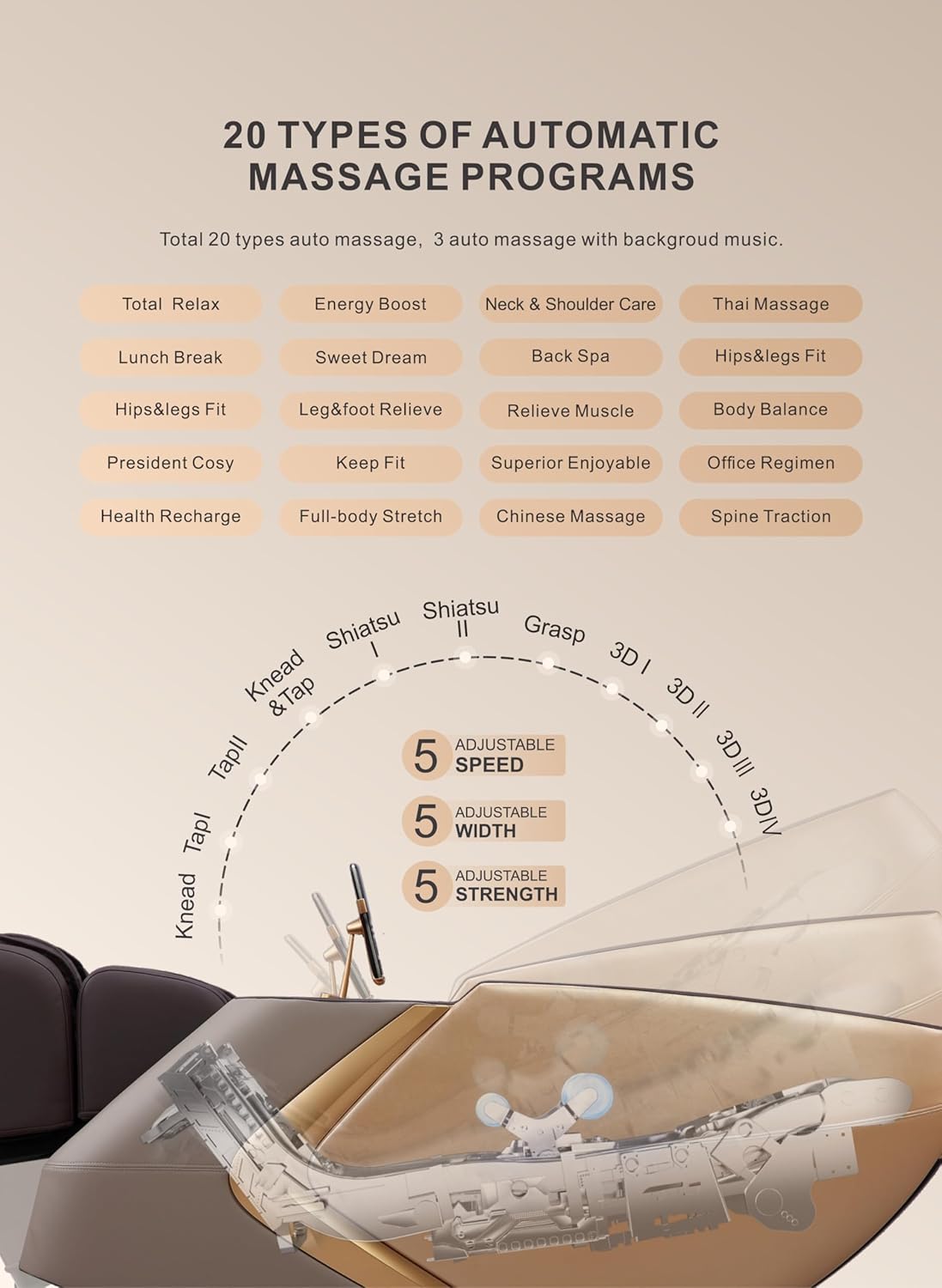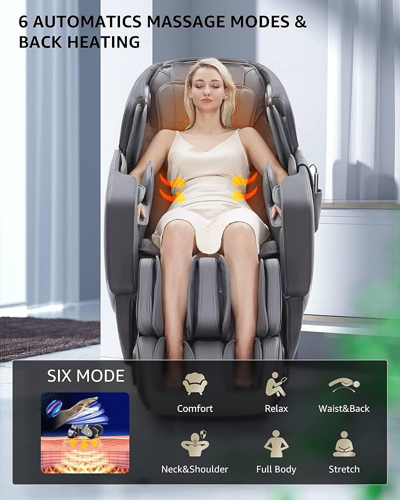 • 12 Automatic Massage Functions Four automatic massage modes: Auto, Full Body Air Pressure, Swing Hip, and Waist Stretch. Upper body automatic massage with three options: full body, neck and shoulders, back and waist.